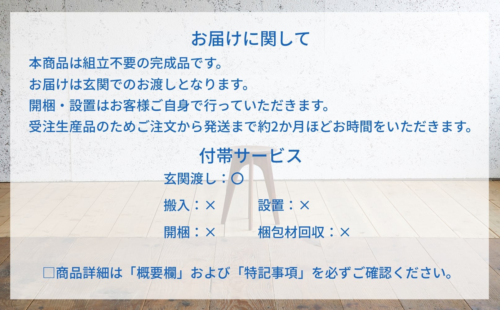 | 発送期日 | 受注生産品の為、ご注文・入金確認後2ヶ月後の発送となります。 |
