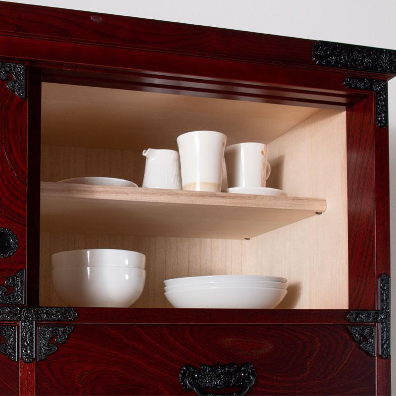 まるで一枚の絵画を思わせるような流れる欅(ケヤキ)の木目と、重厚で艶やかな装飾金具は日本でも古くから百花の王と親しまれる牡丹の花模様。