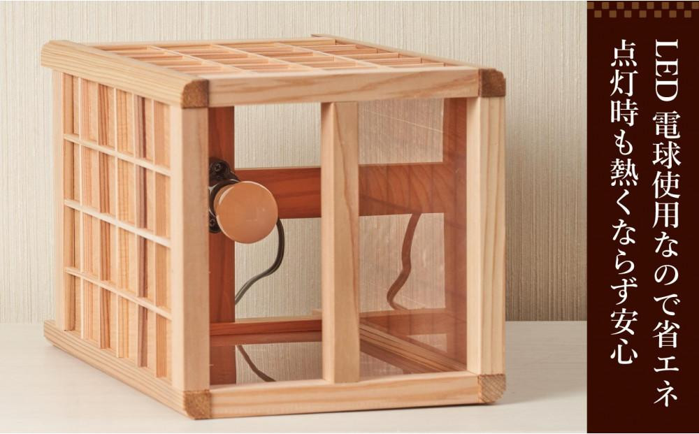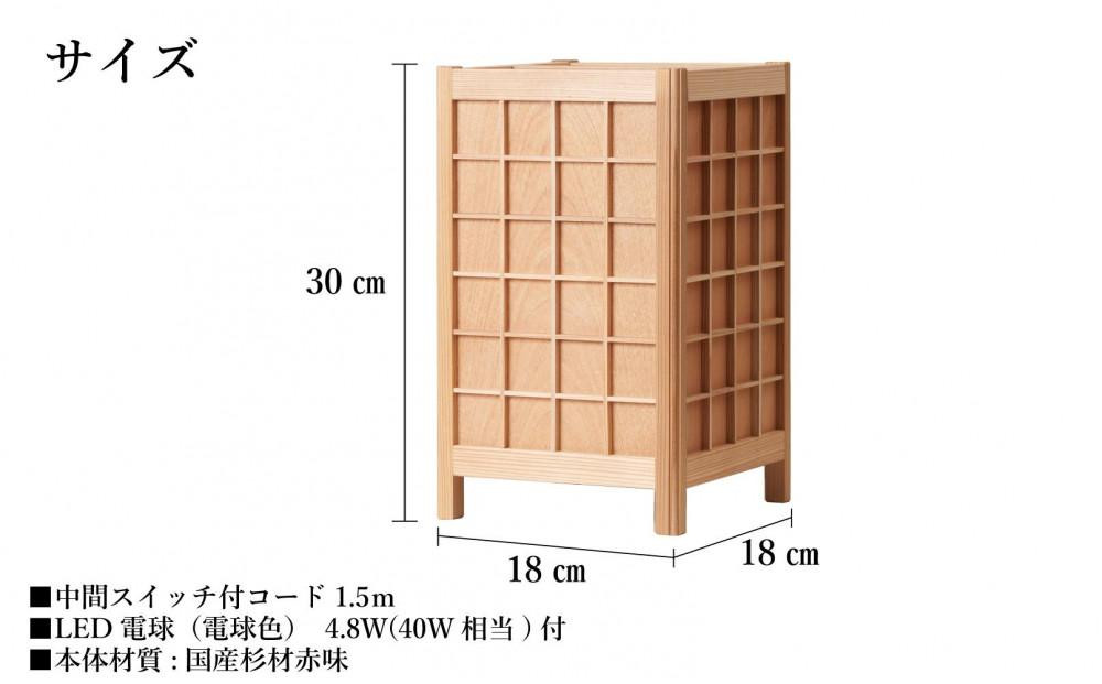 | 容量 | サイズ:H300mm×W180mm×D180mm ■中間スイッチ付コード1.5m ■LED電球4.8W(40W相当)付 電球色 ■本体材質:国産杉材赤味 |