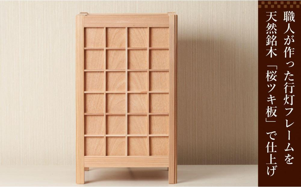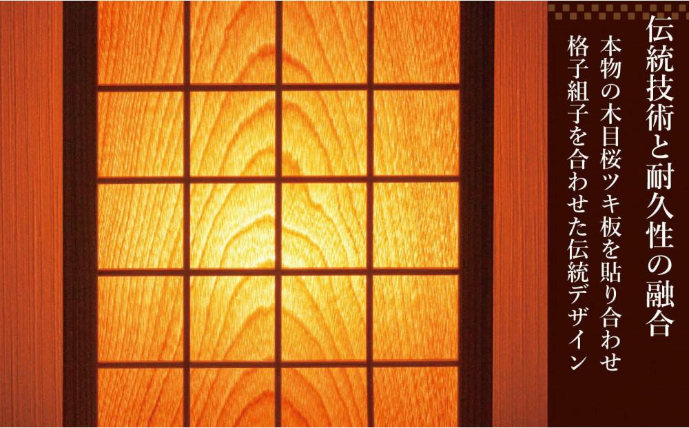 大川市の建具手加工一級技能士の職人が製作した行灯フレームに、本物の木目桜ツキ板貼り合わせ、格子組子を合わせた伝統デザインの商品です。