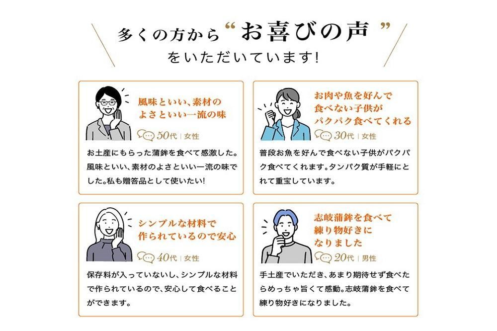 第69回全国蒲鉾品評会にて「農林水産大臣賞」受賞した『特選蒲鉾』と上竹輪、厚焼、えびちぎり、ごぼうちぎり、いかしゅうまいなど人気の商品を集めたバラエティセット。 色々な商品が楽しめるので、食卓が彩られます。 【特選蒲鉾】 口に広がる上品な魚の旨み、もっちりとした弾力、なめらかで美しい肌色など、すべてにおいてワンランク上の自信作。 「魚よりおいしい志岐の蒲鉾」との、高い評価をいただいています。 ★第69回全国蒲鉾品評会にて「農林水産大臣賞」受賞 【上竹輪】 魚の旨みがギュッと凝縮された一品。 近海で獲れた鮮魚をふんだんに使用した、志岐が誇る伝統の代表作です。 香ばしく弾力のある歯ごたえと、立ち上る汐の香りを丸かじりでご賞味ください。 ★第61回全国蒲鉾品評会にて「水産庁長官賞」受賞。 【厚焼】 卵と魚のすりみをフワッ焼きあげた志岐蒲鉾のロングセラー商品。 上品なほのかな甘みがうれしい一品。 職人が、一本一本丁寧に焼き上げています。酢の物・お吸い物にも最適です。 【えびちぎり】 白身魚のすり身にプリプリの海老がたっぷり入った、当店ちぎり天ぷらの中で一番人気の自信作です。 ★第64回全国蒲鉾品評会にて、全国の蒲鉾屋さんが選ぶ「特別賞」を受賞。 【ごぼうちぎり】 白身魚のすり身にささがきごぼうのシャキシャキとした食感がよく合います。 お酒のつまみとして、プレゼントされる方も多い一品です。 【いかしゅうまい】 ふっくらと口当たりのやさしいすり身とぷりぷりと弾力のあるイカを使用し、上品ないかしゅうまいに仕上げました。 蒸しても、揚げても、電子レンジでも、お好みでお楽しみください。 ★第65回全国蒲鉾品評会にて、「水産庁長官賞」受賞。 ※賞味期限が短い商品でございます。商品到着後は、冷蔵庫で保管し、賞味期限内にお召し上がりください。 ◇ご贈答用にもお勧めです◇ 事業者:株式会社 志岐蒲鉾本店 連絡先:0944-88-3168