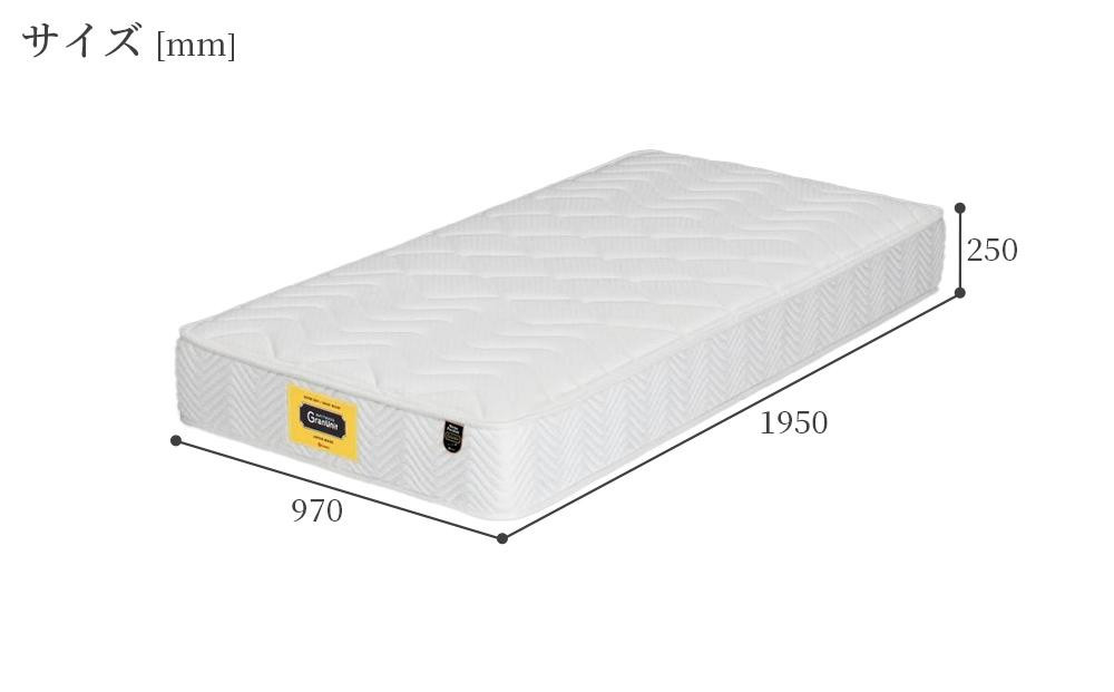 | 容量 | 色柄:ホワイト色/ブラック色 (ニット生地) サイズ:970×1950×250mm ●張地:ポリエステル100% ●詰め物:防ダニ抗菌防臭わた、ウレタンフォーム、フェルト ●スプリングコイルの形状:ちょうちん型ばね(並行配列・9巻ポケットコイル) ●コイル線径:スーパーソフト部1.20mm/ソフト・エッジブロック部1.40mm ●コイル数(S):1176個 |