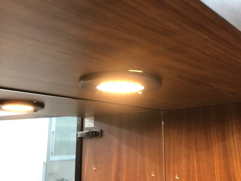 背板は、ミラー付。LEDライト付です。アルミ扉の下のグレーの部分と下台の黒ガラス部分は、引出しです。