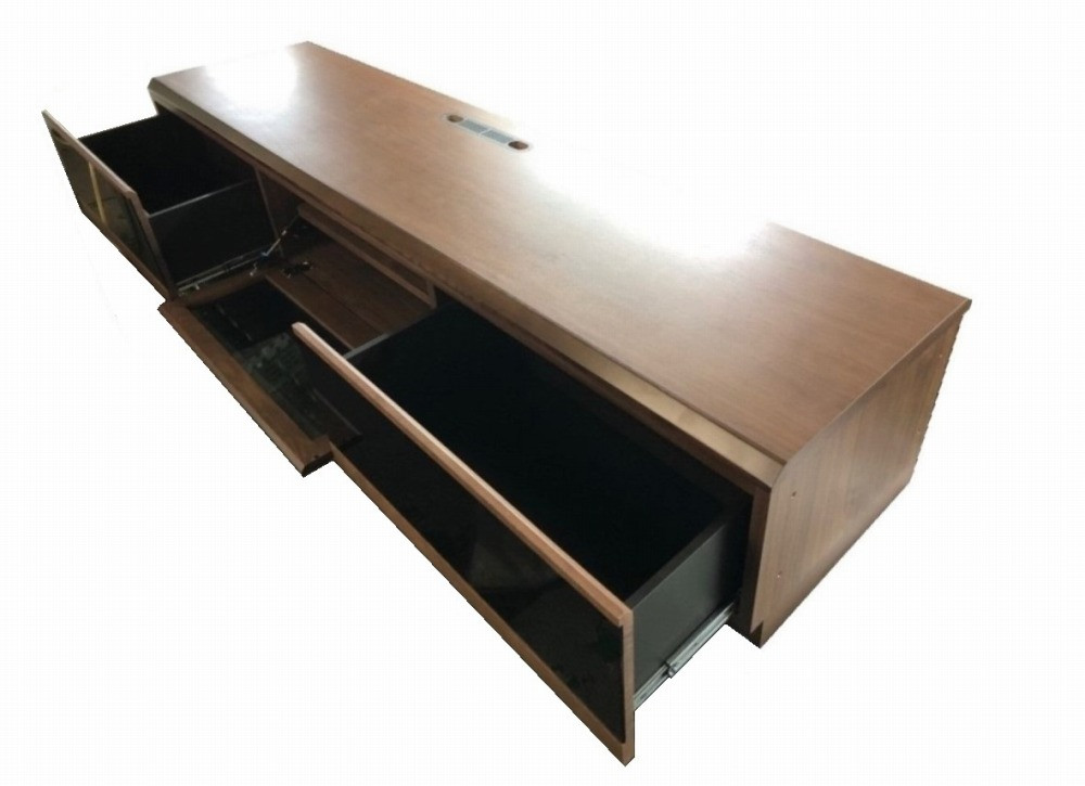 表面材は、アッシュ材に黒ガラスを貼り付けています。本体の黒いガラス部分は、左右が引出しで、中央部は、オーディオ収納スペースです。