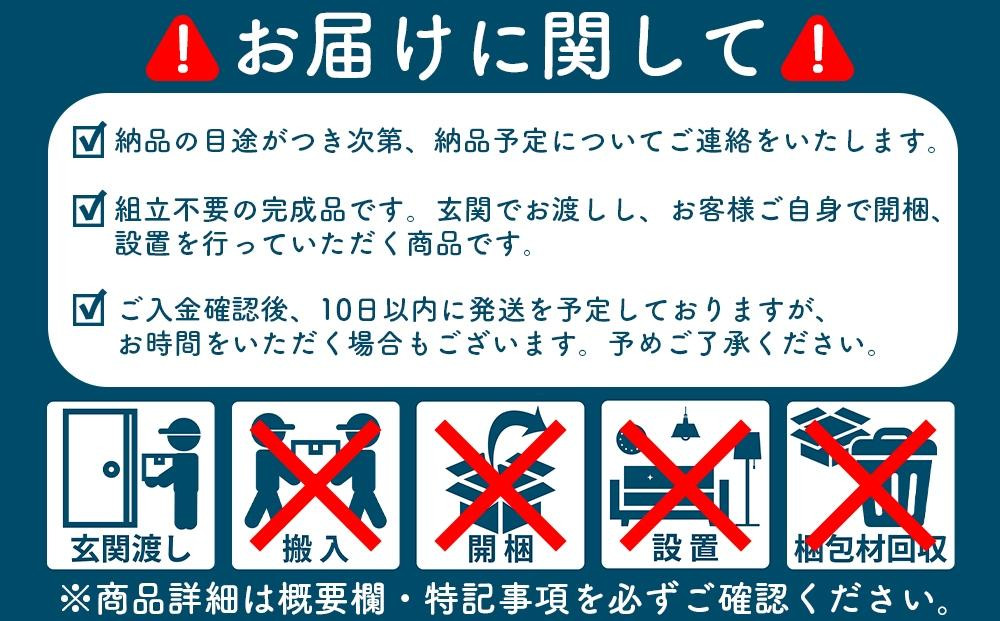 搬入不可・設置不可が理由での返品・キャンセルのご対応はいたしかねます。