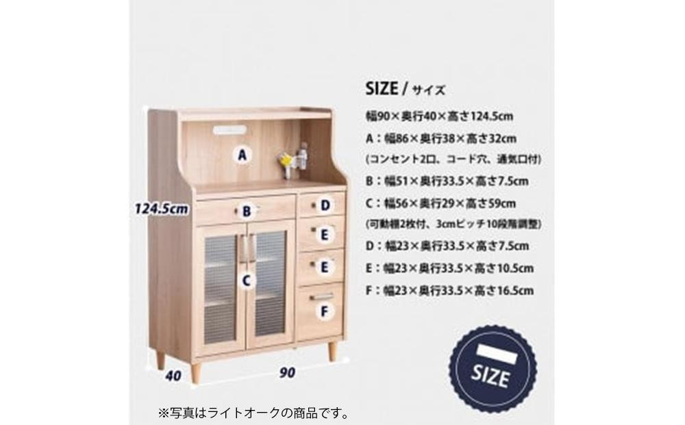 | 容量 | サイズ:幅90×奥行40×高124.5cm 仕様 :強化化粧合板 カラー:ウォールナット 生産国:日本 用途 :食器棚 キッチンボード リビング収納 【搬入経路・お渡しについて】 搬入の際に、階段・踊り場・廊下・間口で入らない可能性が考えられます。 商品注文の際には、サイズをご確認の上、搬入経路(エレベーターサイズ、玄関、お部屋の入口サイズ)・設置箇所十分に確保できるか必ずご確認下さい。 搬入不可・設置不可が理由での返品・キャンセルのご対応はいたしかねます。 玄関・軒下渡しとなります。尚、不要となりました家具の引き取りは出来かねます。 こちらはお客様ご自身で脚の取付けが必要な商品です。 ※追加料金をお支払いただく事で、開梱組立設置に変更も可能です。ご希望の方は事前にお問合せください。 ※大型家具の専用便で配送の場合、お届け予定日確定後の変更をお受けすることができません。直前での変更やご不在による持ち戻りの場合、再配達料金が必要となります(※地域・サイズにより5,000円~) |