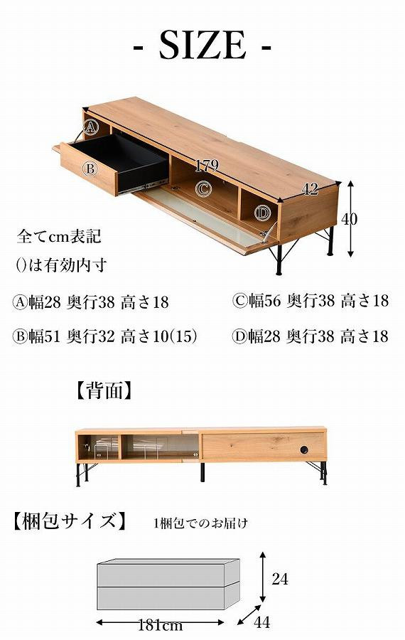 | 容量 | ■表面材 強化紙 スチール脚 ■サイズ 幅179cm×奥行き42cm×高さ40cm 左側収納スペース内寸:幅28cm×奥行き38cm×高さ18cm 引出し内寸:幅51cm×奥行き32cm×高さ10cm(有効内寸:高さ15cm) 中央収納スペース内寸:幅56cm×奥行き38cm×高さ18cm 右側収納スペース内寸:幅28cm×奥行き38cm×高さ18cm |