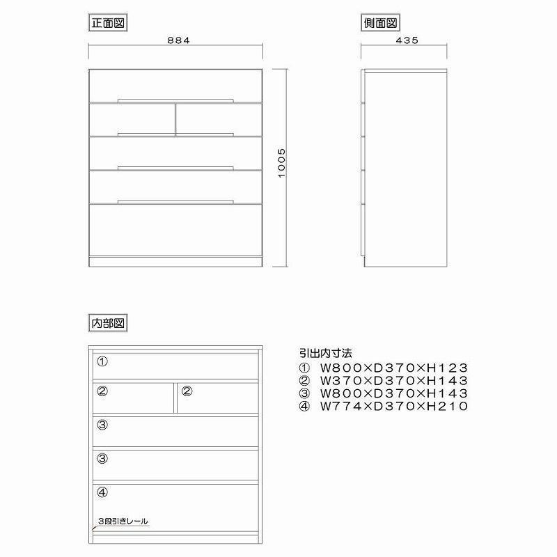 | 容量 | ■商品のサイズ(mm表記) 本体寸法:W884×D435×H1005 ■仕様 表面材:天然木無垢 天板・側板:突板貼り 塗装:ウレタン塗装 引出し:桐箱組(あり組) 垣板厚19mm/底板5mm ※天然木の為、都度木目が異なります。 【環境対応型家具】 ・当社の製品は低ホルムアルデヒドの素材を使用しています。 ・合板、パーティクルボードは「F☆☆☆☆」のものを使用しています。 ・接着剤にはノンホルマリンのボンドを使用しています。 ・塗料は「F☆☆☆☆認定塗料」を使用しています。 この塗料はシックハウスに係るホルムアルデヒド、トルエン、キシレン等の有機化合物質を配合せず塗膜が食品衛生法、食物添加物の基準に適合する安全型塗料を使用し塗装します。 ★こちらのシリーズは幅4タイプ(88/102/118/151cm)×高さ3タイプ(4段/5段/6段)×素材4タイプ(アルダー/メープル/ホワイトオーク/ウォールナット)のバリエーションがございます。 各商品ページよりお申込みくださいませ。 |