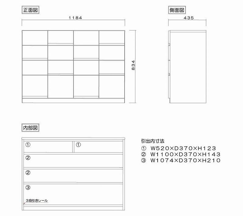 | 容量 | ■商品のサイズ(mm表記) 本体寸法:W1184×D435×H834 ■仕様 表面材:天然木無垢 天板・側板:突板貼り 塗装:ウレタン塗装 引出し:桐箱組(あり組) 垣板厚19mm/底板5mm ※天然木の為、都度木目が異なります。 |