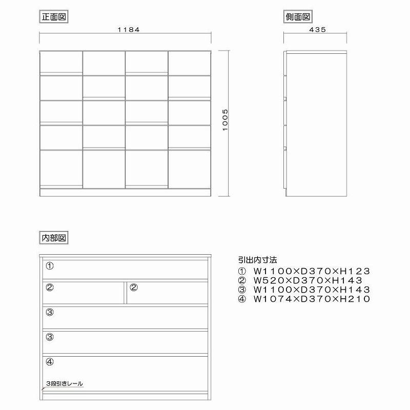 | 容量 | ■商品のサイズ(mm表記) 本体寸法:W1184×D435×H1005 ■仕様 表面材:天然木無垢 天板・側板:突板貼り 塗装:ウレタン塗装 引出し:桐箱組(あり組) 垣板厚19mm/底板5mm ※天然木の為、都度木目が異なります。 |