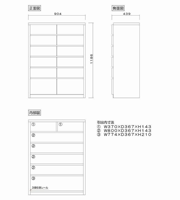 | 容量 | ■商品のサイズ(mm表記) 本体寸法:W904×D439×H1186 ■仕様 表面材:強化シート真空貼 天板:強化シート 引出し:桐箱組(ロッキング組) 垣板:19mm厚(桐無垢) 底板:5mm厚(桐柾目突板) |