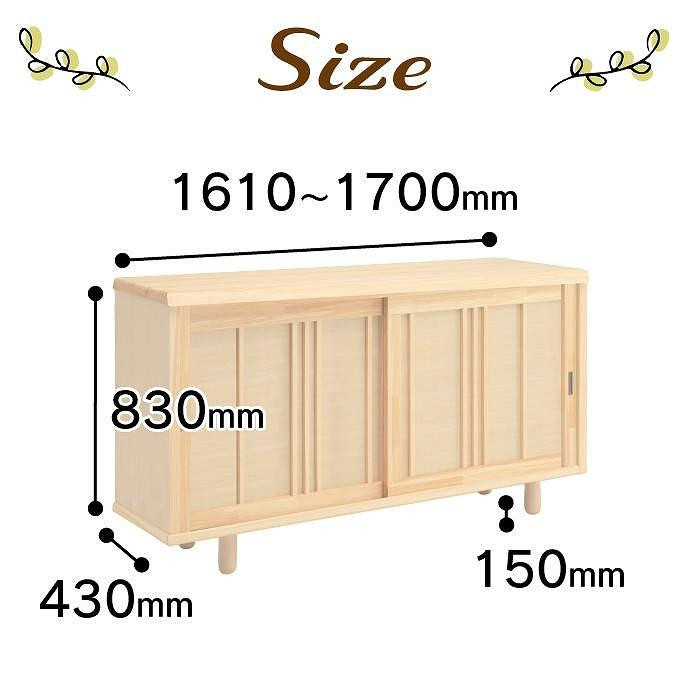 | 容量 | ■本体に脚を付けるだけの完成品です。 横幅を1cm単位でオーダーができます。 ■サイズ 本体:奥行43cm×高さ83cm×幅161~170cm(脚の高さ+15cm) ご希望の横幅サイズを1cm単位でお伺いいたします。 ■商品発送につきまして 受注後生産となりますので、お届けまでに約40日程かかります。準備でき次第、お届け日調整のご連絡をいたします。 ■材質 天板:厚さ4.5cm 桧(ヒノキ)無垢(ムク)集成材 側板:桧突板(ツキイタ) 内部:化粧板 戸枠:桧無垢(ムク)材 鏡板:桧突板(ツキイタ) 扉 :引き戸(スライド扉) レールで軽くスムーズな開閉が可能 狭い場所でも、開閉可能なことがメリット 開き戸に比べ比較的気密性が低く、臭いが逃げやすい構造 塗料・接着剤:F☆☆☆☆…*1 *1…使用される方の安心・安全を考慮し、シックハウスの原因の一つ、ホルムアルデヒドの発散が非常に低い建材を使用 ■付属品 棚 板:木製棚板(化粧板)1.7cmの厚み8枚 左右『6cm間隔9段階』で、履物に合わせた高さ調整が可能 棚受け:金属製の棚ダボがしっかりと棚板を支えます。 専用脚:15cm・4本(1cm程度の微調整可能なアジャスター付) ※無償で長さ30cmまで2本に変更することができます。 その場合、脚は2本のみとなりますのでご注意ください。 玄関は水はけの為、傾斜があります。 アジャスターを軽く手で回して、傾斜に合わせて水平調整、高さ調整やがたつき調整ができます。 ■配送 開梱設置サービス可能な家財便で発送 ※配達業者にてお礼品の開梱、組立て、設置、ダンボールの引き上げまで行いますのでご安心ください。 ※配送不可地域:北海道・沖縄・離島 ■製造 日本製・国内自社工場で製造 (一社)日本家具産業振興会の「安全、安心、環境」という点に配慮した国産家具を生産するメーカーとして認定された事業者です。 ■その他 【無垢(集成材)家具について】 ・画像はイメージです。天然木のため、色合いや木目には個体差(ばらつき)がございます。 ・お手入れは、柔らかい布で乾拭きするか、かたく絞った雑巾で軽く拭いてください。 ※一部材料に海外産を使用しています。 ☆無垢材の家具は手入れ次第で長持ちし、経年変化も楽しめます。 |