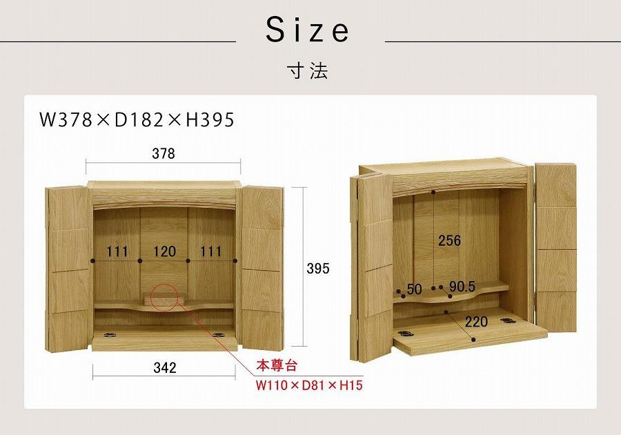 | 容量 | ■商品のサイズ(mm表記) 仏壇本体:W378×D182×H395 ※扉を閉めた状態 専用台:W444×D240×H505 ■仕様 表面材:天然木無垢 塗装:オイル塗装 |