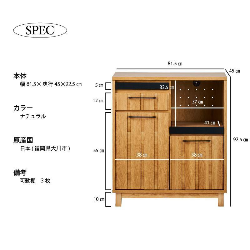 | 容量 | 【カラー】 ナチュラル 【サイズ】 ●全体:W81.5×D45×H92.5cm 【材質】 本体:MDF強化シート 前板:ストライプガラス |