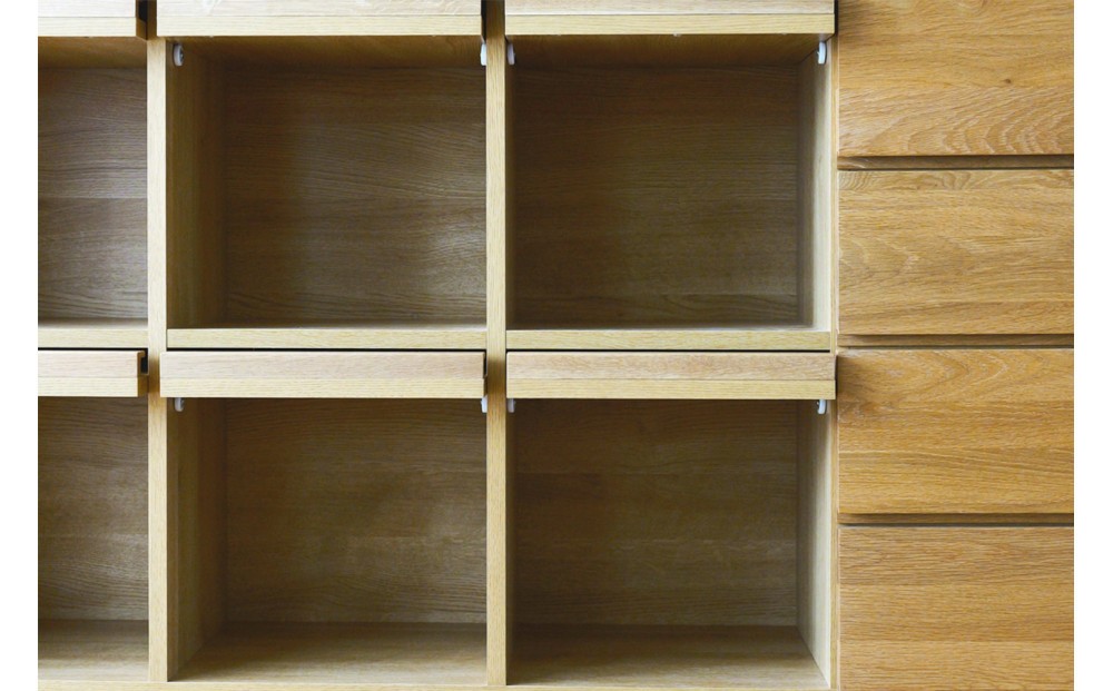 前板には無垢材、天板・側板には突板を使用し天然木の素材感溢れる仕上がりとなっています。