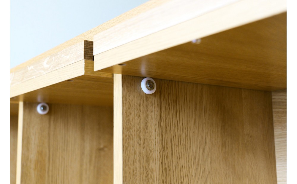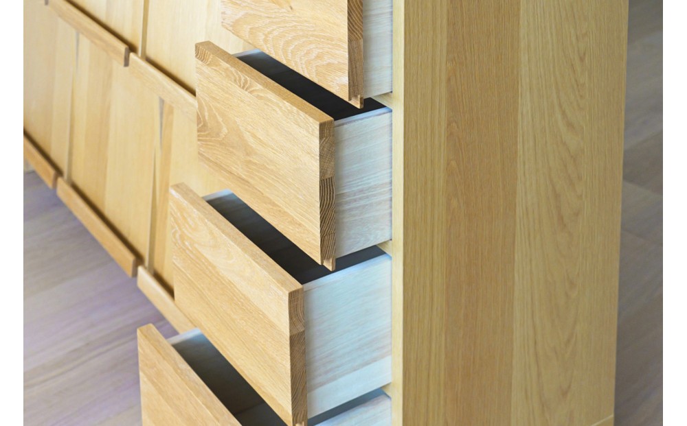 前板には無垢材、天板・側板には突板を使用し天然木の素材感溢れる仕上がりとなっています。