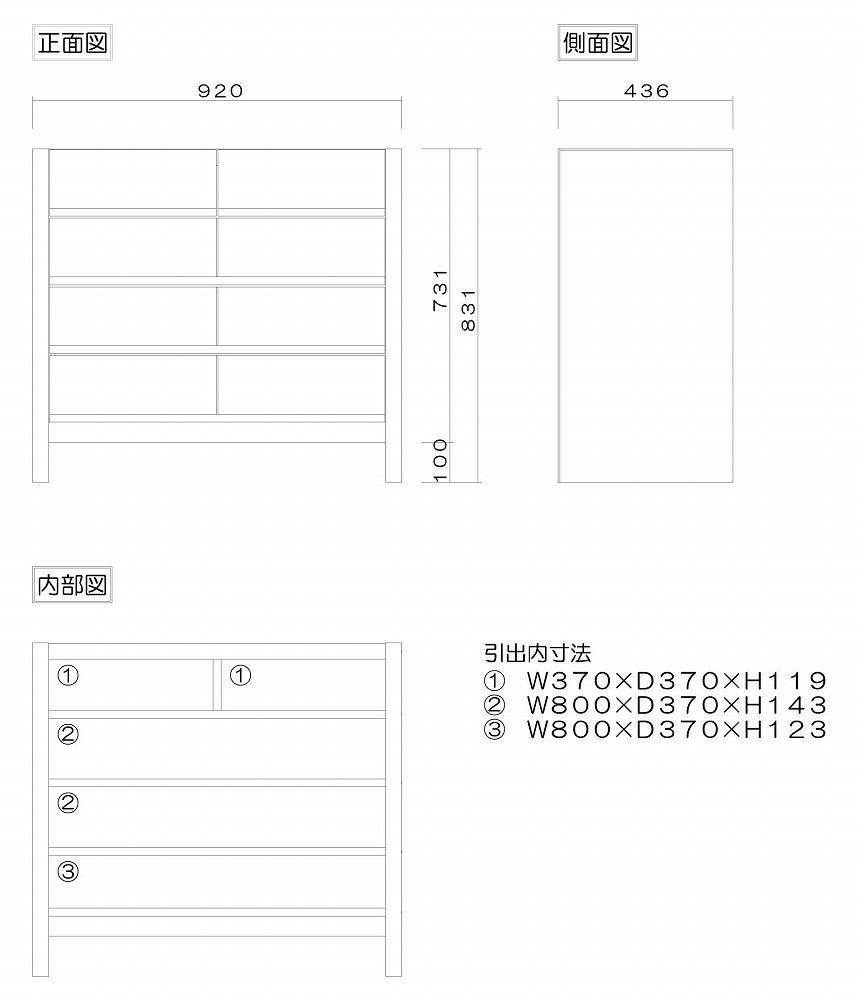 | 容量 | ■商品のサイズ(mm表記) 本体寸法:W920×D436×H831 ■仕様 表面材:天然木無垢(メープル/ホワイトオーク/ブラックチェリー/ウォールナット) 天板・側板:ウォールナット突板貼り 塗装:ウレタン塗装 引出し:桐箱組(あり組) ※天然木の為、都度木目が異なります。 |