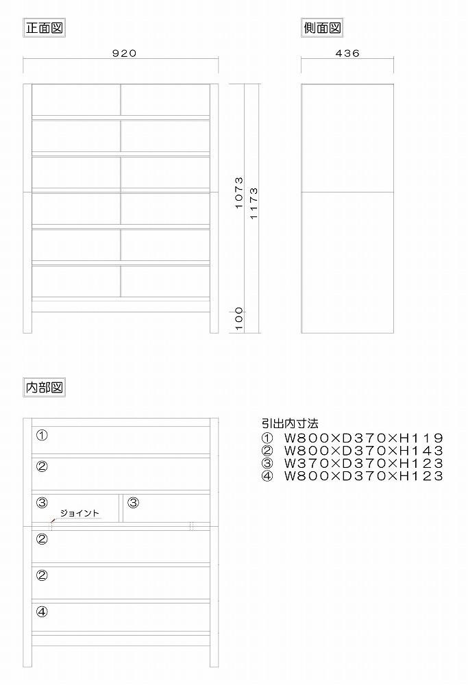 | 容量 | ■商品のサイズ(mm表記) 本体寸法:W920×D436×H1173 ■仕様 表面材:天然木無垢(メープル/ホワイトオーク/ブラックチェリー/ウォールナット) 天板・側板:ウォールナット突板貼り 塗装:ウレタン塗装 引出し:桐箱組(あり組) ※天然木の為、都度木目が異なります。 |