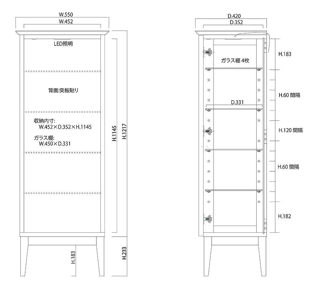 ■収納内部には可動の強化ガラス棚が4枚付いており、上下段共に60mmピッチ(一部120mmピッチ)の14段階に調整が出来る、自由な収納スペースが作れます。