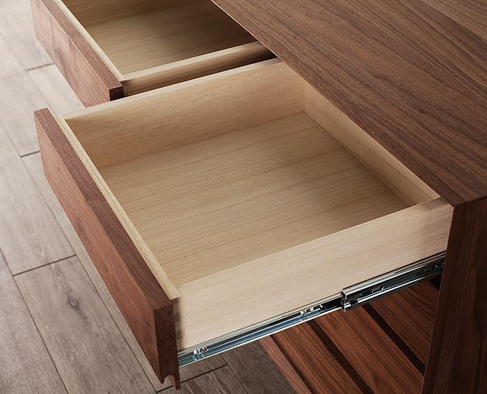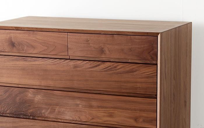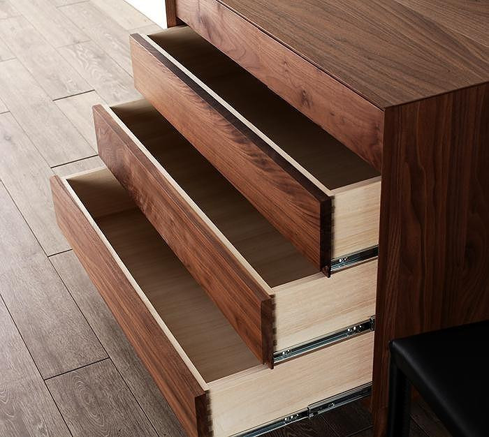 ■引出しの前板と脚部分は無垢材、その他は突板(フラッシュ構造)で製造しております。
