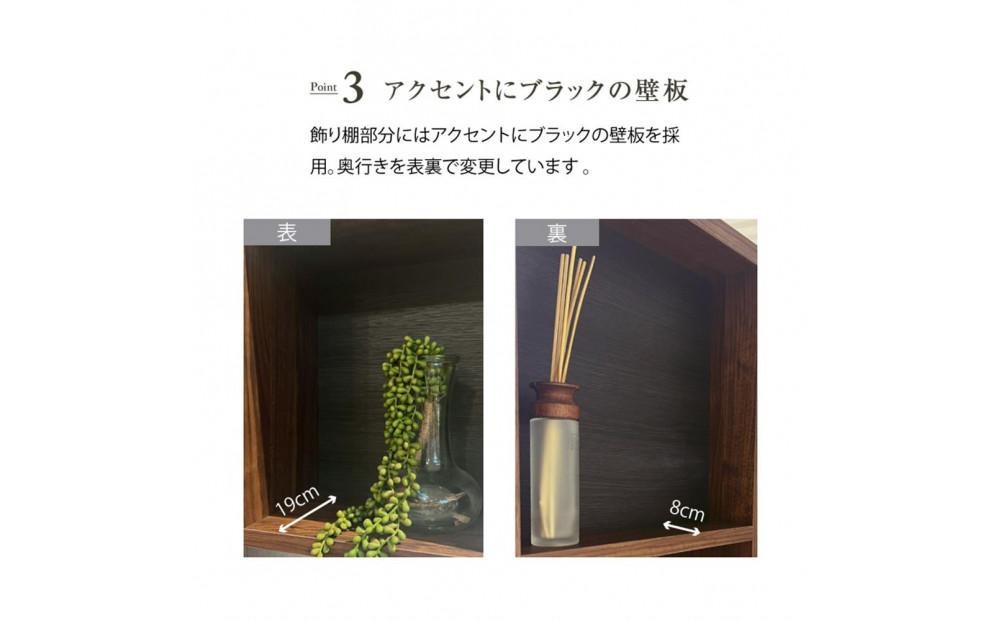飾り棚部分は、壁板をアクセントで黒色として、奥行きを表裏で変更しています。