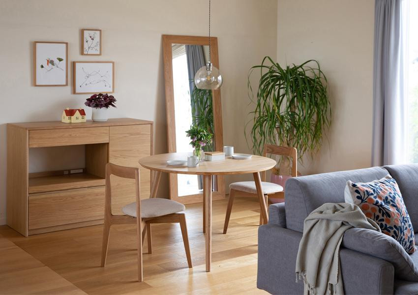 食卓を囲んで顔を合わせて座ることができるのがラウンドテーブル。 基本的に直線で構成されることが多いお部屋に円形のテーブルを置くことで柔らかな雰囲気になり、さらに空間のアクセントにもなります。