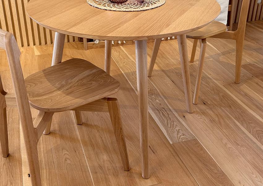 バルーンと仕様を変更した脚部。チェアに座っても広々と感じてほしいという思いから、床に向かって広がるデザインを採用しました。床に向かって細く伸びるテーパー脚が、より細さを強調しお部屋全体の雰囲気を引き締めます。無垢ならではのしっとりとしたなめらかな手触りも魅力的です。