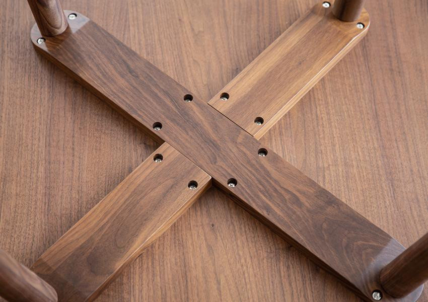 二つの木材をそれぞれ半分ずつ切り欠いて、切り欠いた部分を組み合わせて継ぐ「十字相欠き継ぎ」。木材同士の接地面が多いため、強度が高いのが特徴です。さらに補強のため、円形にビスを打ち込んでいます。この組み方を採用することで4本の脚に均等に天板の圧を分散し、同時に均等に補強します。