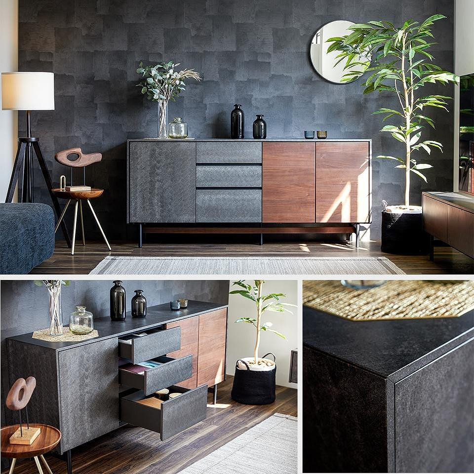 ● 洗練された高級感とモダンなスタイルを取り入れることができる「アルヴィン」のサイドボード。フルスライドレールの引出収納に加え、扉内は収納物の幅・高さに合わせた豊富な収納スペースに可動棚を完備。3cmピッチで高さ調整できるので、無駄なく収納できます。 また、プリンタやルーターなども収納できるよう壁板に配線孔も設けています。