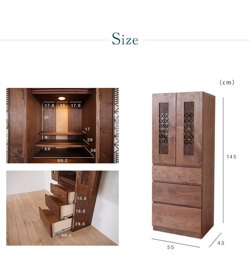 | 容量 | 外寸:幅55×奥行43×高さ145cm 素材:ウォールナット無垢材、ウォールナット突板、バーズアイメープル突板、桐材 |