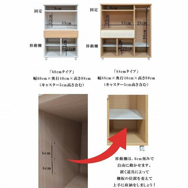 | 容量 | ・サイズ(約) 幅88cm×奥行40cm×高さ99cm(キャスター5cm高さ含む) ・カラー:ホワイト・ナチュラルよりお選び下さい ・備考:完成品 |