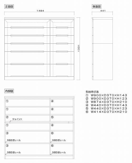 | 容量 | ■商品のサイズ(mm表記) 本体寸法:W1484×D441×H1331 ■仕様 表面材:ニレ無垢材 天板:ポリ化粧合板 塗装:ウレタン塗装 引出し:桐箱組(あり組) 垣板:19mm厚(桐無垢) 底板:5mm厚(桐柾目突板) |