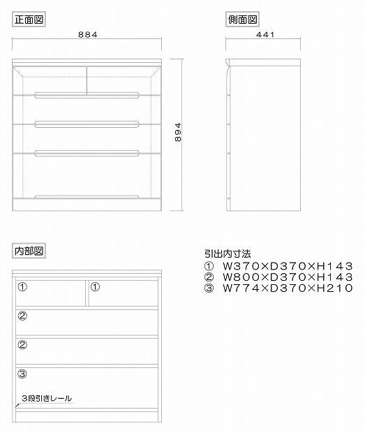 | 容量 | ■商品のサイズ(mm表記) 本体寸法:W884×D441×H894 ■仕様 表面材:ニレ無垢材 天板:ポリ化粧合板 塗装:ウレタン塗装 引出し:桐箱組(あり組) 垣板:19mm厚(桐無垢) 底板:5mm厚(桐柾目突板) |