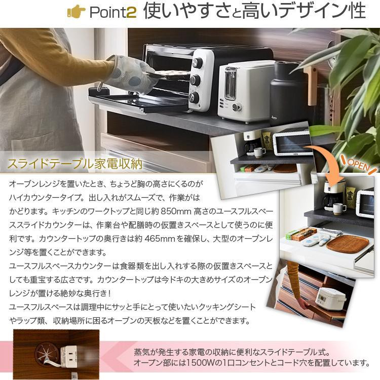 便利なフルスライドの3段引き出し収納があり、1段目にはカトラリーや小物、2段目にはマグカップやカレー皿、3段目には小型調理家電やペットボトル、鍋、食品ストックなどが収納できます。