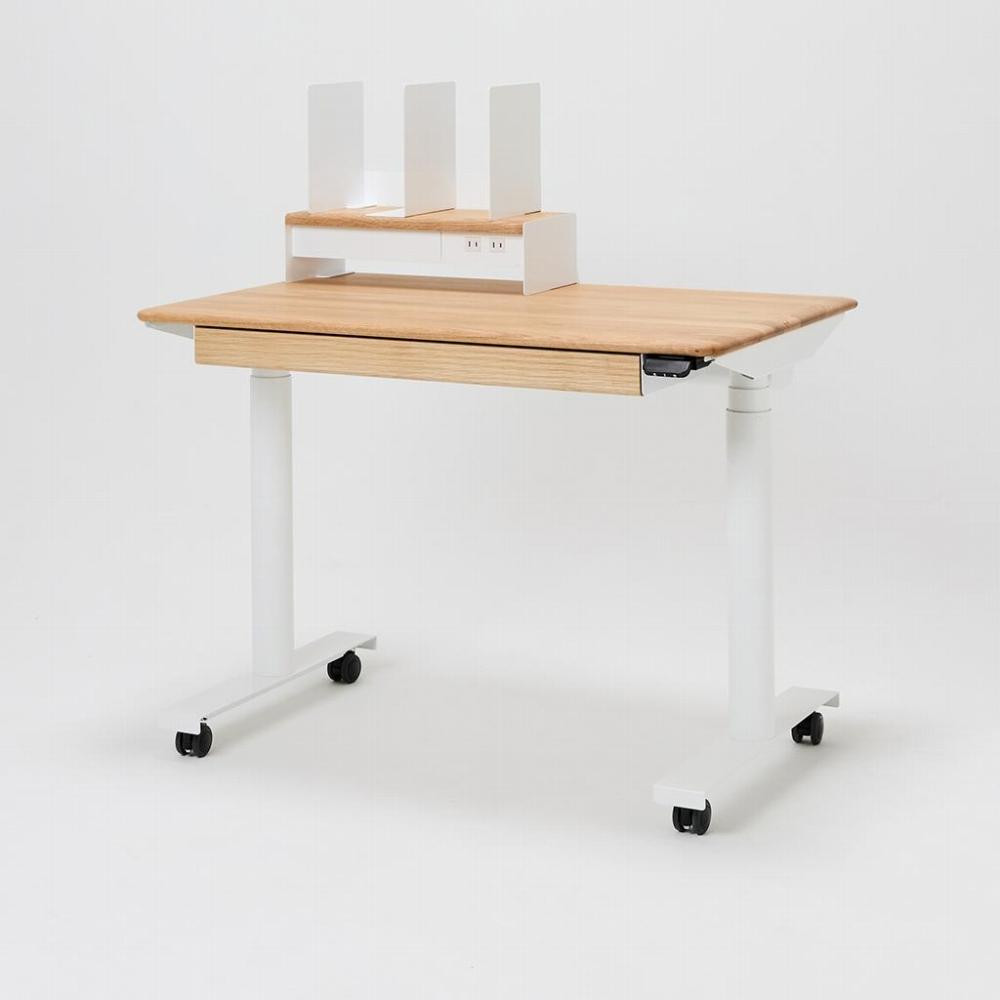 北欧の家具にも多く使われている、温かみのあるオークの無垢集成材天板と、円筒形の白の昇降脚の組み合わせによる、洗練されたカラーリング。
