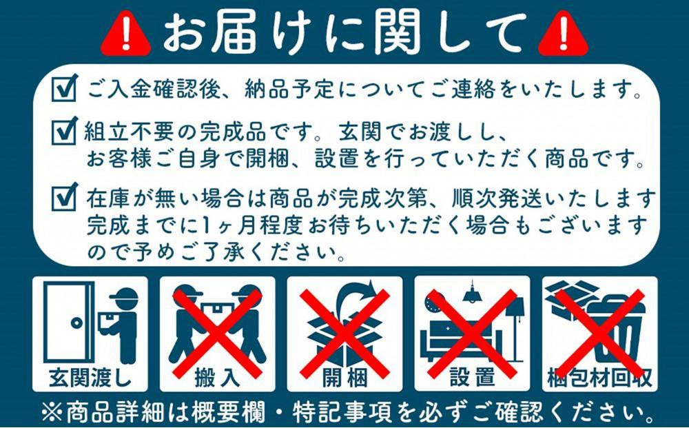 商品は大型の完成品のため、搬入の際に、階段・踊り場・廊下、間口で入らない可能性が考えられます。