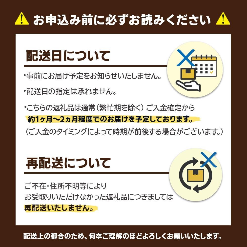 | 発送期日 | ご入金確定日から、1~2ヶ月程で発送させていただきます。但し、12月~1月にご寄附をいただいた場合は、最大4ヶ月程度かかる場合がございます。何卒、ご了承ください。 |