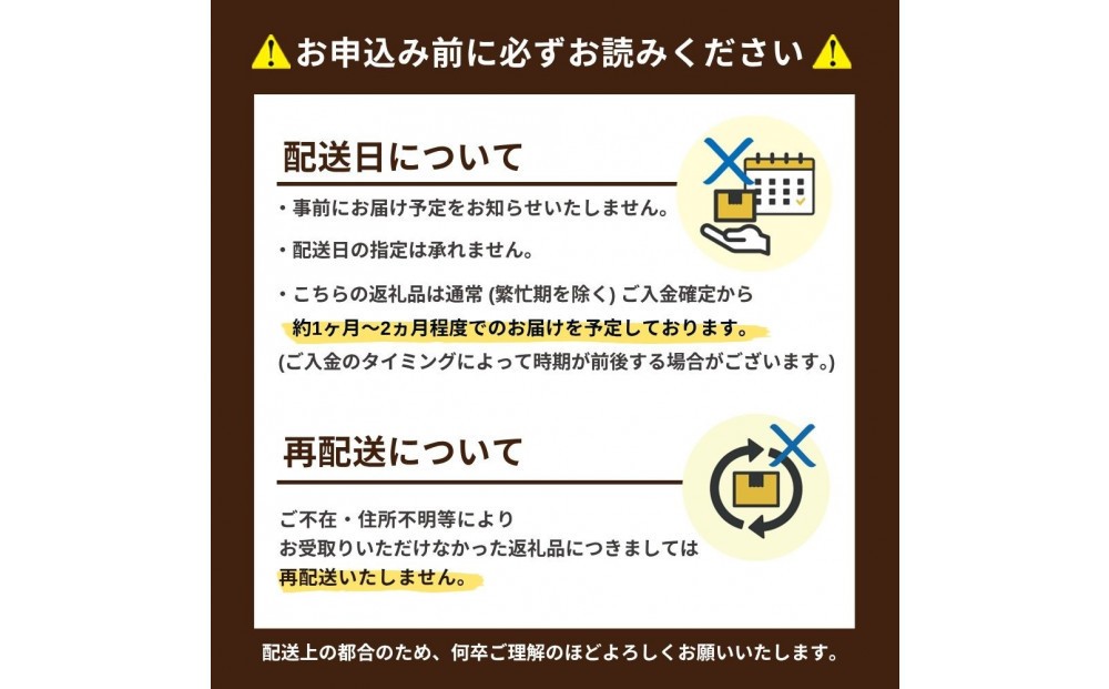 | 発送期日 | ご入金確定日から、1~2ヶ月程で発送させていただきます。但し、12月~1月にご寄附をいただいた場合は、最大4ヶ月程度かかる場合がございます。何卒、ご了承ください。 ※返礼品の配送に関して日付指定はお受けできませんのでご注意ください。 |