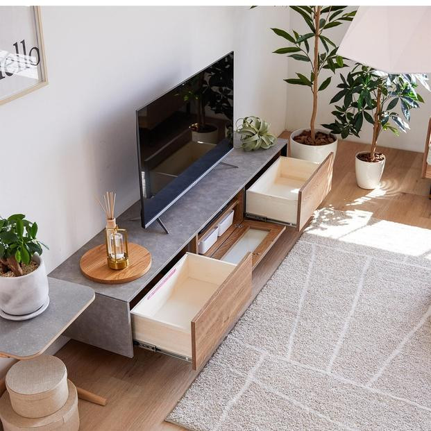 お気に入りのメディアがたっぷり収納できる引き出しが左右に付いています。リビング小物や生活用品を収納するのにも役立ちます。