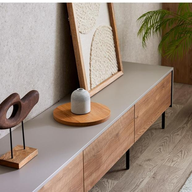 目を惹く前面は、力強いヴィンテージ調の木目デザイン。無機質なグレーとのコントラストはクラス感ただよう佇まい。