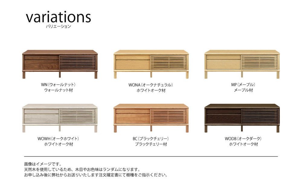 ウォールナット、ホワイトオーク、ブラックチェリー、メープルを使用した天然木のローボードです。