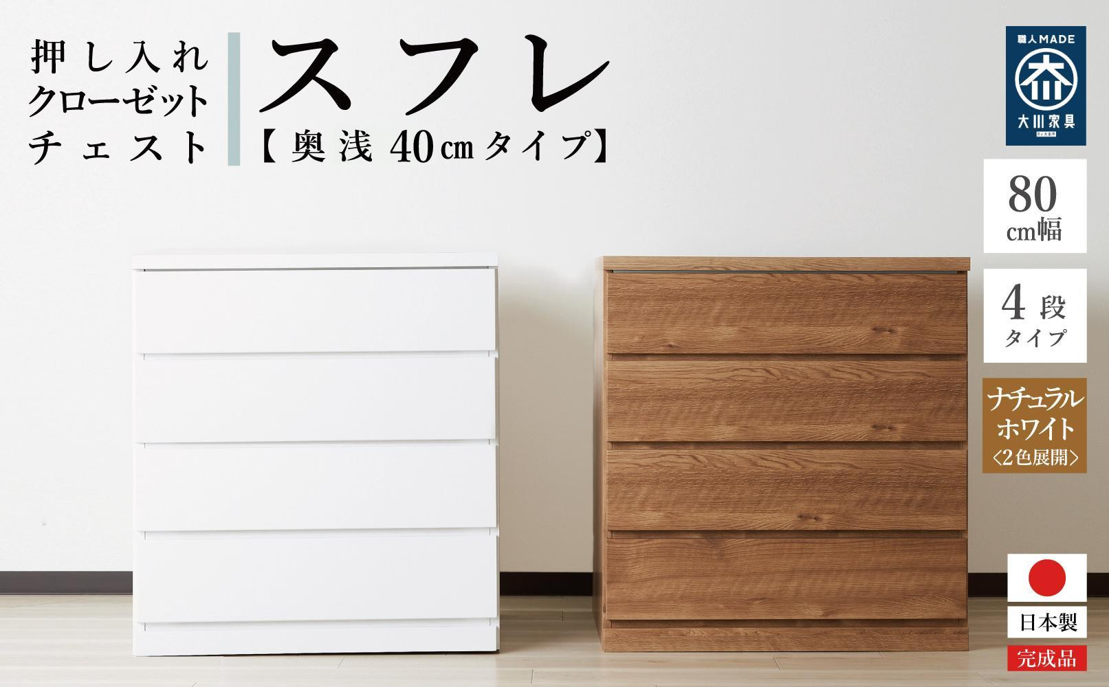 | 容量 | 商品名:押入れタンス(スフレ)80cm幅4段タイプ サイズ:幅80cm×奥行40cm×高さ85.9cm 材 質:プリント紙化粧繊維板フラッシュ加工 色 :ナチュラル or ホワイト 仕 様:全段スライドレール付(引き出し・引出し) 特 徴:背面:化粧仕上げ 備 考:キャスター後付 生産地:日本製(福岡県大川市) ※通常使用範囲外でのご利用はお避け下さい。(極端に熱い物をのせる、製品に乗り上げるなど。) ※直射日光や冷暖房器具の周囲などは避けて設置してください。木材の割れ、変形などの原因となります。 |