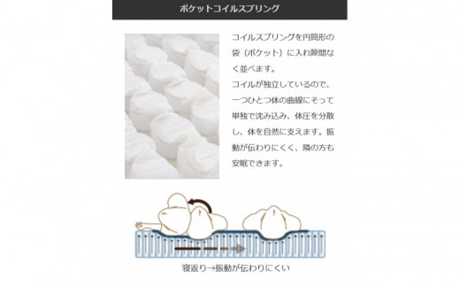 マットレス内部の「ポケットコイル」はコイルが独立しているので、一つひとつ体の曲線にそって単独で沈みこみ、体重を分散し、体を自然に支えます。