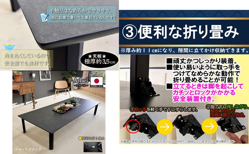 お客様お助けワード:座卓 折りたたみ 大きい 完成品 テーブル 軽量 国産 大理石調 ダイニングテーブル 折りたたみテーブル 大理石風 座卓テーブル おしゃれ 和風 和室 洋室 ちゃぶ台 折れ脚 ローテーブル 折り畳みテーブル 黒 ブラック グレー 自社製造 和モダン 大理石柄 小さめ コンパクト 大きめ 食卓テーブル リビング学習デスク 小さい 大川家具職人 畳んで立てかけて収納できます! アイカメラミン化粧板 MDF材 無垢集成材 頑丈 Arbel