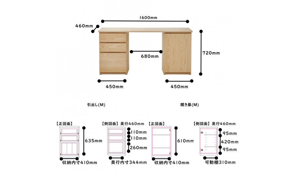 | 容量 | 外寸:幅1600mm×奥行460mm×高さ720mm 材質/天板・前板 無垢材 F☆☆☆☆ 材種/ホワイトアッシュ 塗装/オイル塗装:F☆☆☆☆(健康と環境にやさしい仕様です) |