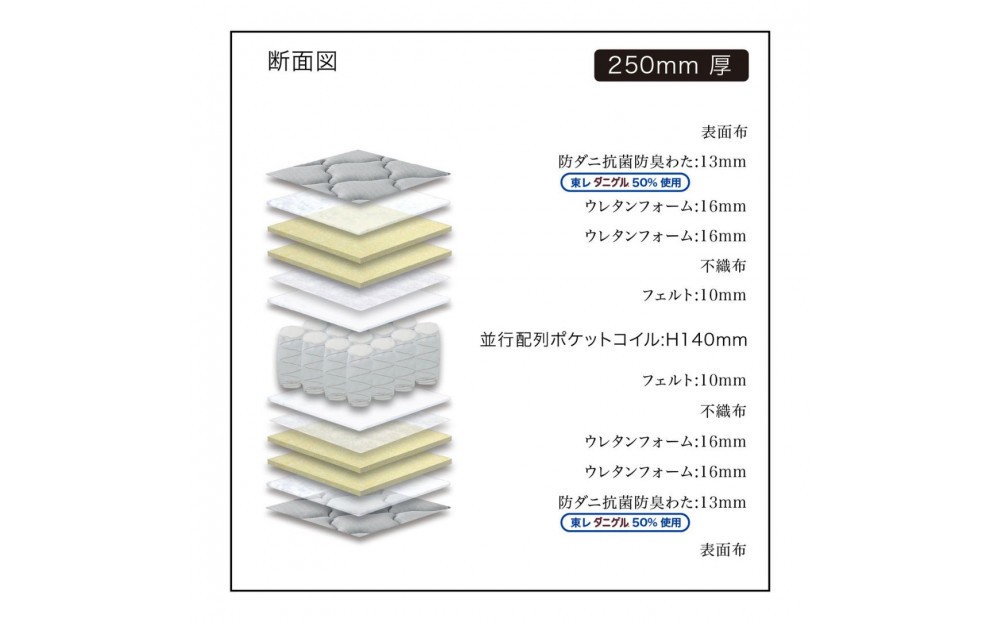 | 容量 | シングルサイズ マットレス 【カラー】下記3色よりお選びください ・グレー色(ニット生地) ・ブラック色(ニット生地) ・ホワイト色(ニット生地) ●サイズ:970×1950×250mm ●張地:ポリエステル100% ●詰め物:防ダニ抗菌防臭わた(東レダニゲル®50%使用)、ウレタンフォーム、フェルト ●スプリングコイルの形状:ちょうちん型ばね(並行配列・6巻ポケットコイル) ●コイル線径:2.0/2.4mm ●コイル数:465個 |