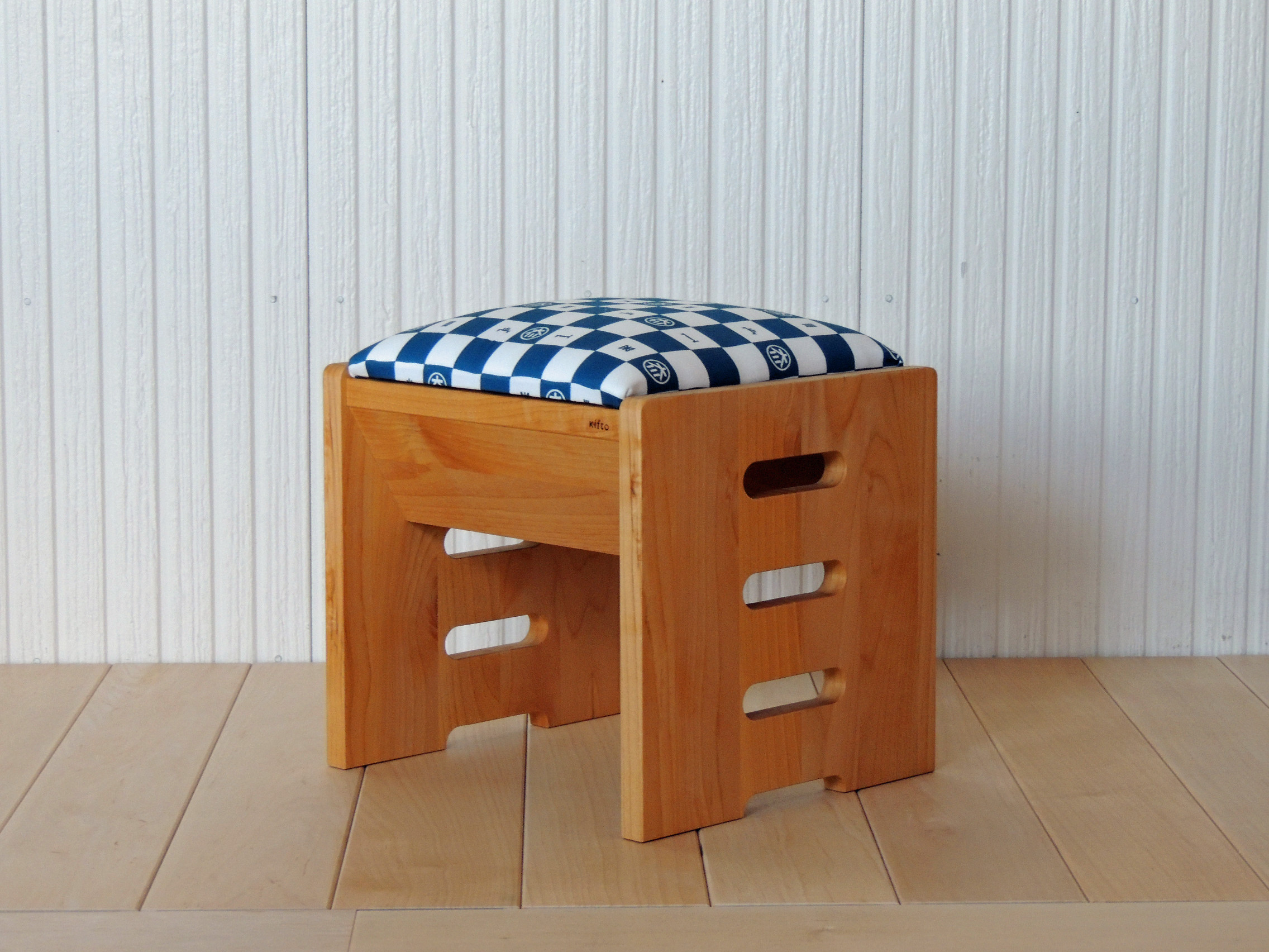 こどもイスというよりも大人がちょこっと座るのにいいかも!シンプルなキュービックデザインで大人が座っても大丈夫な強度、持ち運びしやすくリビング・こども部屋・それに玄関などいろんな所で大活躍しますよ!木部アルダー材、座面は大川市ブランドロゴを使用したオリジナル市松模様です。