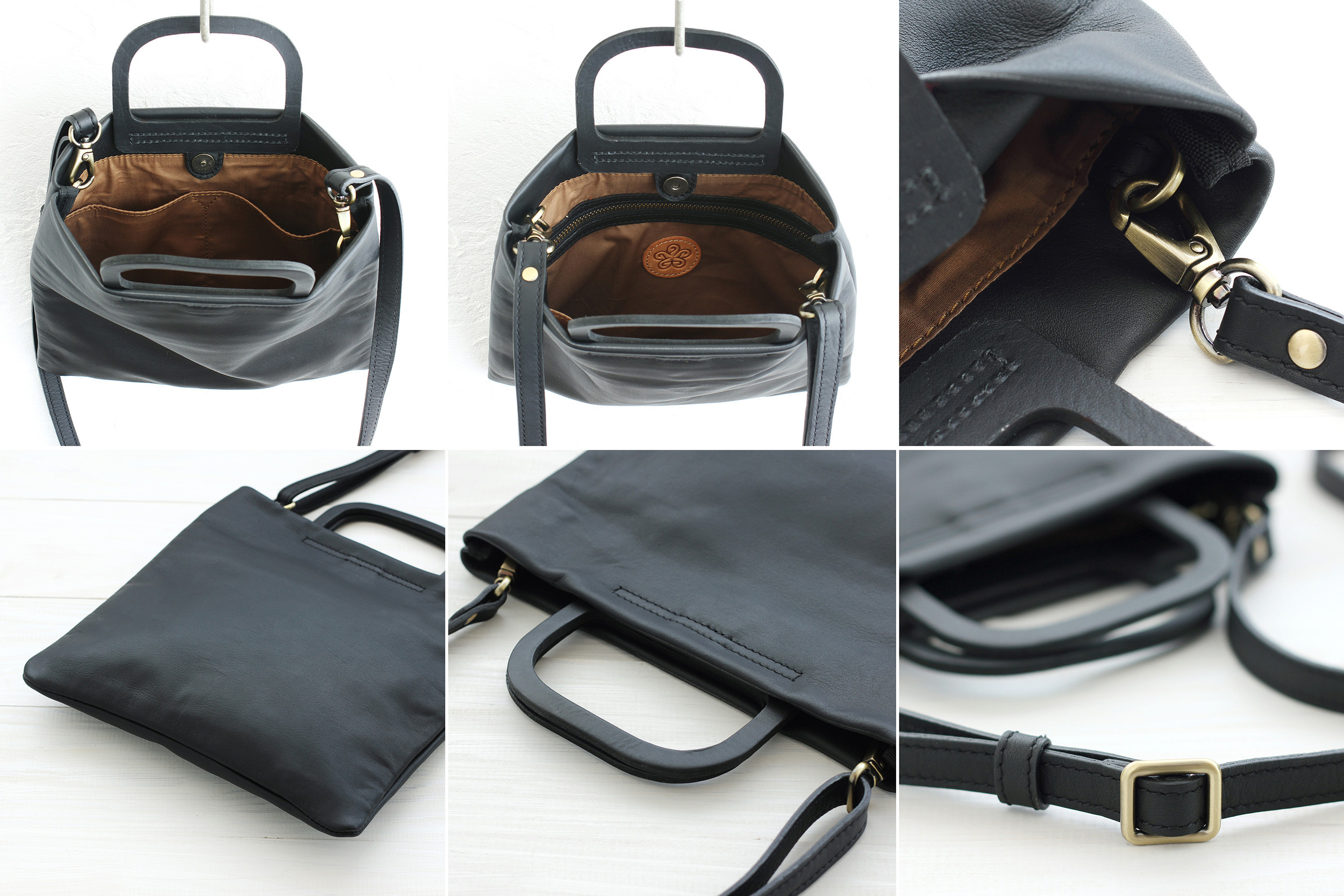 大人の女性が持ちやすいフラットでシンプルなポシェットは、カラダにやさしく寄り添うソフトな本革製、ハードレザーの小さなハンドルが付いています。