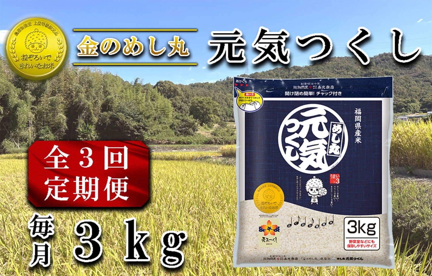 CE-109_【定期便3回】令和7年米 金のめし丸元気つくし 3Kg(1袋)×3回