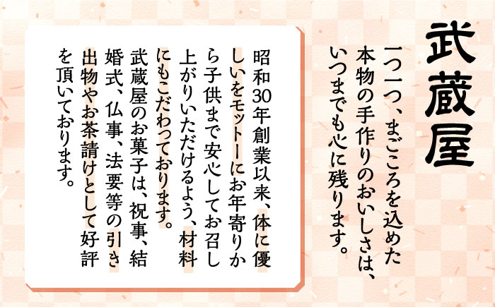 ■豊前を代表する銘菓 ゴマと子宝島の天然塩がアクセントの豊前の代表的銘菓です。 たっぷりの黄身を練り込んだ黄身餡を薄皮で包みシナモンをまぶしています。 お茶のお供や、手土産にもオススメな一品です。是非、お楽しみくださいませ。 ■武蔵屋の想い 「一つ、一つ、まごころを込めた本物の手作りのおいしさはいつまでも心に残ります。」 昭和30年創業以来、現在3代目に至まで一貫して守り続けてきた武蔵屋の味はここに秘められております。 また、体に優しいをモットーにお年寄りから子供さんまで安心してお召し上がりいただけるよう材料にもこだわっております。 武蔵屋オリジナル”求菩提の里””しゃくなげの香””銅板経最中”は豊前の味としお茶請として、 祝(慶)事、結婚式、仏事、法要等引き出物として 好評を頂いております。 饅頭 進物箱 お土産 ギフト 和菓子 贈り物 手土産 お茶 お中元 豊前 福岡